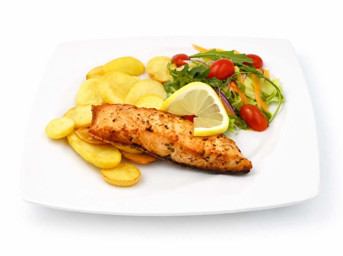 Filet z łososia pieczony na maśle klarowanym z talarkami ziemniaków i miksem sałat