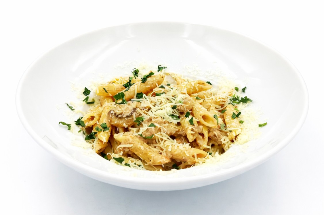 Makaron penne Boscaiola z wołowiną i pieczarkami w sosie śmietanowym, posypany twardym serem i natką pietruszki