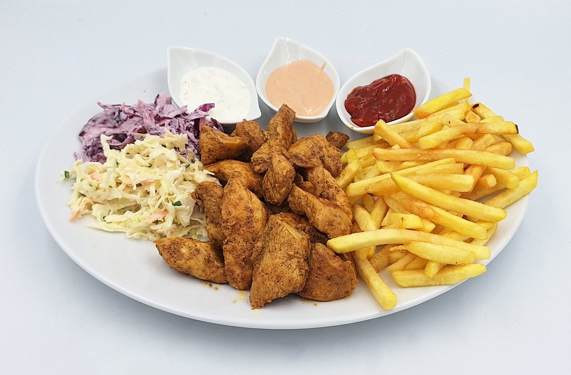 Shorma drobiowa z frytkami, trzema sosami i surówkami